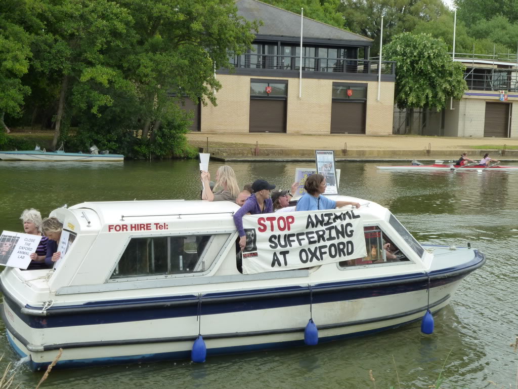 On Saturday 24th July, people enjoying their leisure activities along the River Thames in Oxford were treated to the sight of a SPEAK banner clad motor boat making its way along the river. The twelve SPEAK members on board loudly informed others on the river of the useless and horrific experiments carried out on live animals in the infamous Oxford University Laboratories (how sound travels over water!). From small single person crafts to the large tourist laden vessels, the support we received was phenomenal.