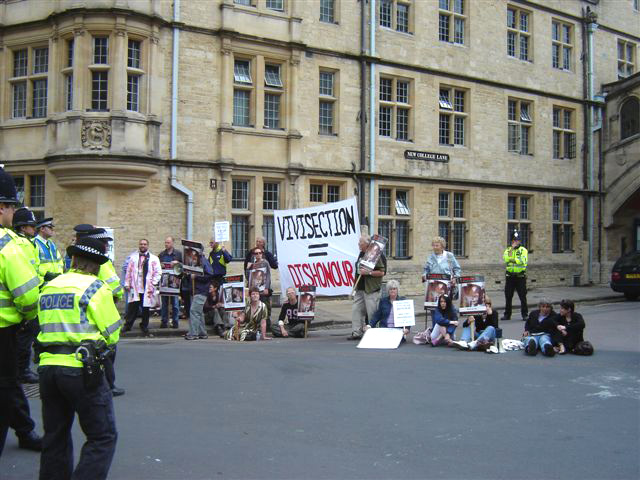 This year, a more sinister course of events transpired. The problems first arose when a member of the University was heard telling the police, “Haven’t you shut them up yet” - “them” being the protestors. The officer was heard to reply, “Not yet, but we will.” What transpired was a brutal police attack directed at the small crowd; a crowd containing women, children and the elderly as the police did the university’s bidding. SPEAK have in the past maintained that what the university object to most is the fact that the picture postcard image people have of Oxford - an image the university are keen to propagate that is slowly being eroded by SPEAK. The real side of Oxford University is being exposed - a more sinister side; a side that not only involves the torture, mutilation and death of thousands of non human animals but also involves the deaths of thousands of human animals, such as in the Vioxx trials conducted by university professors. On this occasion what the university objected to most was the fact that the truth being spoken by SPEAK supporters could be heard by the celebrants within the Sheldonian Theatre. At about 11am the police, who well outnumbered the protesters, became very agitated as the university increasingly put pressure on the senior officer present to remove the protestors. The police’s response was to impose a section 14 notice and move the protest on. However, as the demonstration was entirely peaceful a number of protestors objected to this heavy handed approach and some decided to sit down. It should be noted however that as the road was already closed, no disruption was caused to the traffic. It was at this point that the police moved in attacking people. Five protesters were arrested - all have since been released, but with injuries and extensive bruising from the violence of the police attack. One man was attacked by about five police officers and he could be heard screaming in pain. All those arrested were seen being pushed with force against stonewalls; one of the arrested was an elderly woman over 70 years old. Despite her age, the police showed no mercy and she to was badly bruised and thrown around. Other protesters were not arrested but just as brutally treated. One woman with a damaged back for which she is registered disabled was repeatedly punched in the back by a female police office despite telling them about her injury. She witnessed her friend being grabbed from behind and thrown across the road by two officers, with the result she was left limping due to an injury to her knee. One protestor complained of having a policeman put his hands around her throat. Journalists looked on in shock and one was even in tears as she witnessed the attack by the police. The officers, who had clearly lost control of themselves, carted the four prisoners off and surrounded the remaining protestors who continued their demonstration. One officer was so keen to do the university’s bidding he was seen walking up and down the police line shouting at fellow officers to line up in front of the protestors in order to hide them from the public and presumably shield the officers attacking peaceful protestors. The police then made the decision to march the protestors out of sight altogether, having surrounded the demonstrators, they proceeded to force the demonstrators in the direction of Broad Street and towards St Giles all the while pushing and hitting people in order to make them move. At this stage another protestor was arrested because she dared object to the police brutality. When the demonstrators had been pushed back to St Giles, they were informed that they would be confined to an area out of sight of the public. However, the massed ranks of yellow jacketed officers surrounding them allowed no one to see them. By this stage it was about 12.30pm, and they were then informed they could protest until 2pm flanked by officers and out of sight of anyone. Then they would be banned from protesting anywhere within the City of Oxford for the rest of the day. Given the fact the police had conspired with Oxford University in order to deny people the basic human right to protest, those assembled by force decided it was not worth participating in this travesty for any longer and they disbanded. People left disgusted at the behaviour of Thames Valley Police, but vowing to remain unbowed in the face of police brutality. Oxford University had conspired with Thames Valley Police to suppress a lawful demonstration in the hope that animal rights protestors would be cowed into submission – how they have under estimated our determination to stop the torture currently taking place inside the university. The animal rights movement is at its strongest when their backs are against the wall and make no mistake we will be fighting back! If you were there and/or have video footage of the protest we ask you to get in touch with us. If you were there and witnessed the attacks please send witness statements into SPEAK. Anyone wishing to complain, please write letters to the address below. It is important that all the assaults are documented so that we are able to use them at a later stage. It is now vital that the police are forced to act in an appropriate way. To this end we are now putting in place plans that will highlight and document the illegal behaviour of Thames Valley Police officers so that we can use them in future legal proceedings. Professional Standards Dept, Thames Valley Police, Oxford Road, Kidlington, OX5 2NX |